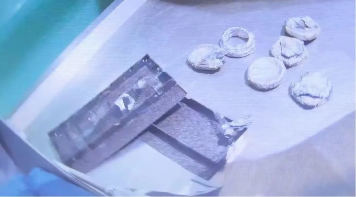 近日,北京海关所属大兴机场海关对进境旅客行李进行监管时,发现一名选择“绿色通道”通关的旅客行李机检图像异常。经开箱查验,现场关员在该旅客行李箱内衬下的拉杆中间发现用烟盒和锡纸包裹的疑似象牙手镯8件。